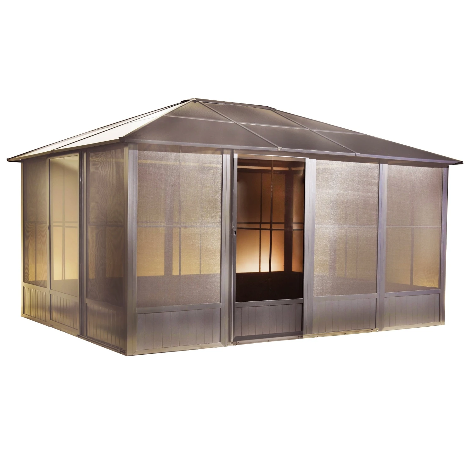 Imagine your own private refuge for relaxation where you are protected from snow, rain, mosquitoes and UV-rays all while being surrounded by the beautiful outdoors. It is now possible to enjoy your backyard all year round with this 10′ x 14′ Ashville Hard Top Sun Shelter by Sojag.