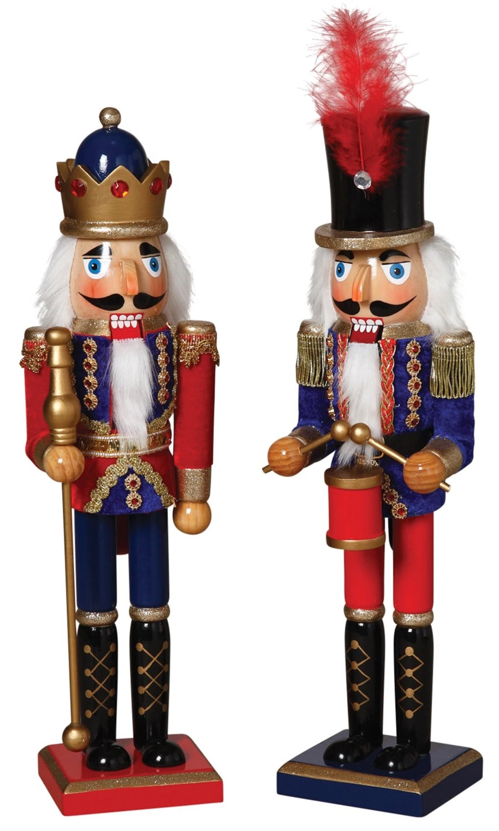 - One nutcracker is wearing a top hat, is holding a red snare drum and golden drumsticks and stands atop a blue and gold wooden base