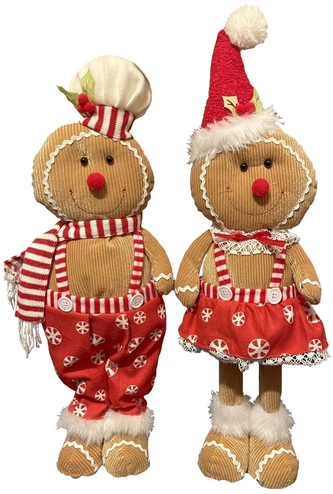 - One figurine is wearing a Santa hat and a red and white overall dress