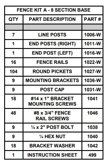 - Features round fence pickets with non-adjustable blow-molded mounting brackets