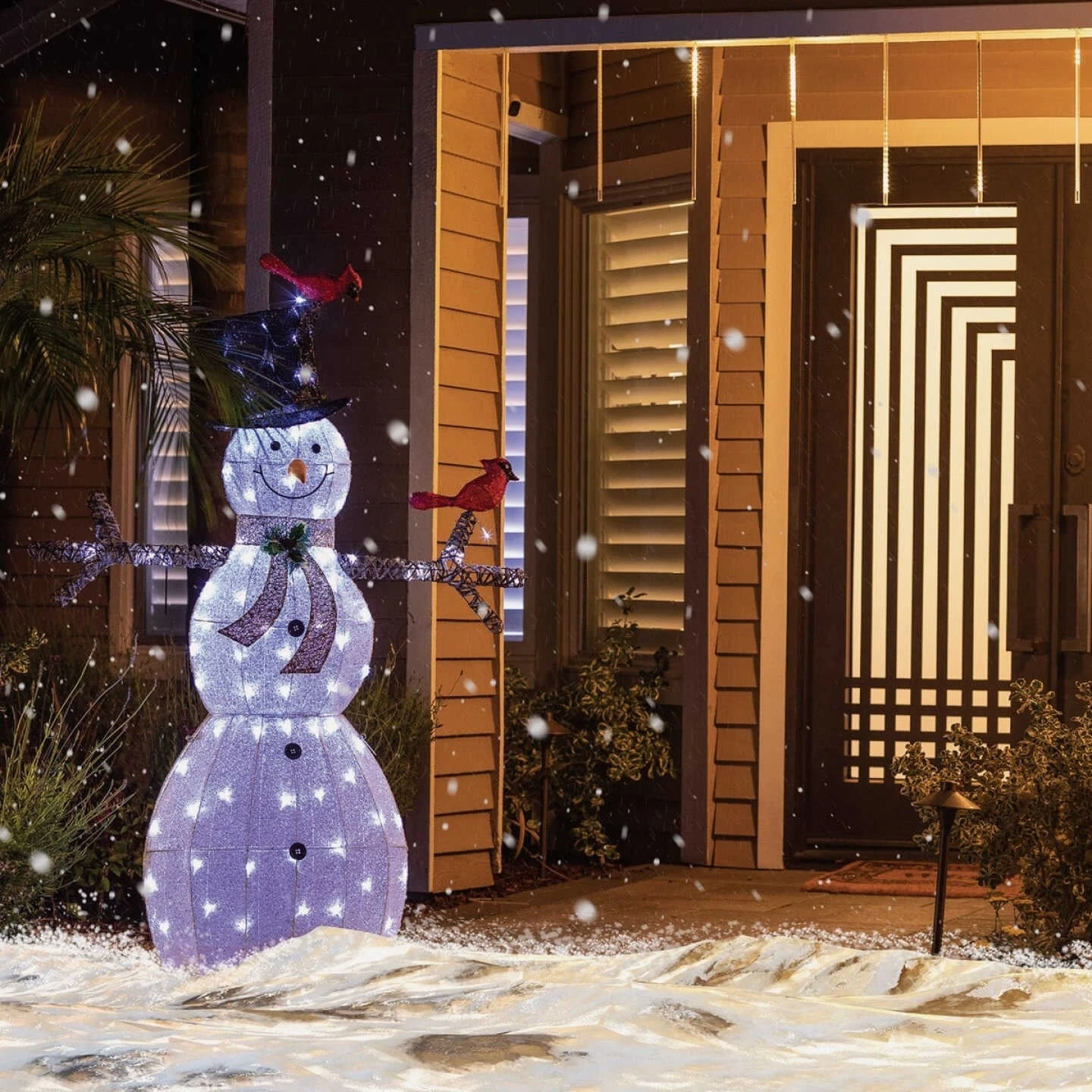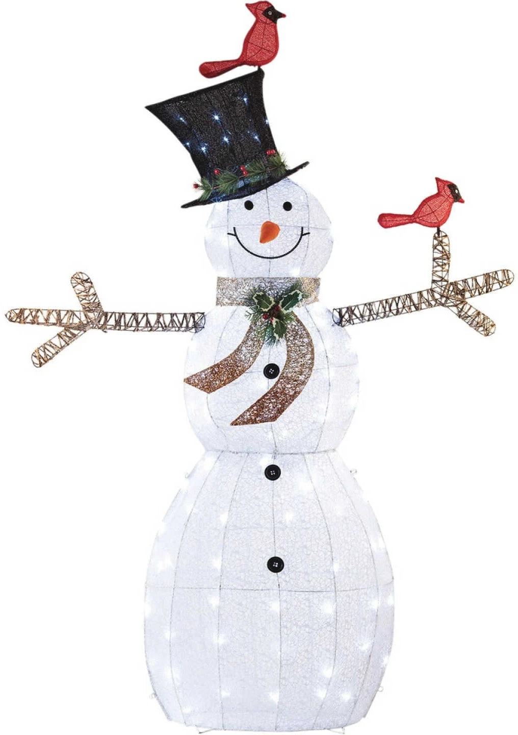 This Snowman Lawn Decoration is the perfect addition to any holiday display. Made with a white mesh covering and decorated with red birds, this festive lighted sculpture was designed to provide a soft glow to your surroundings.