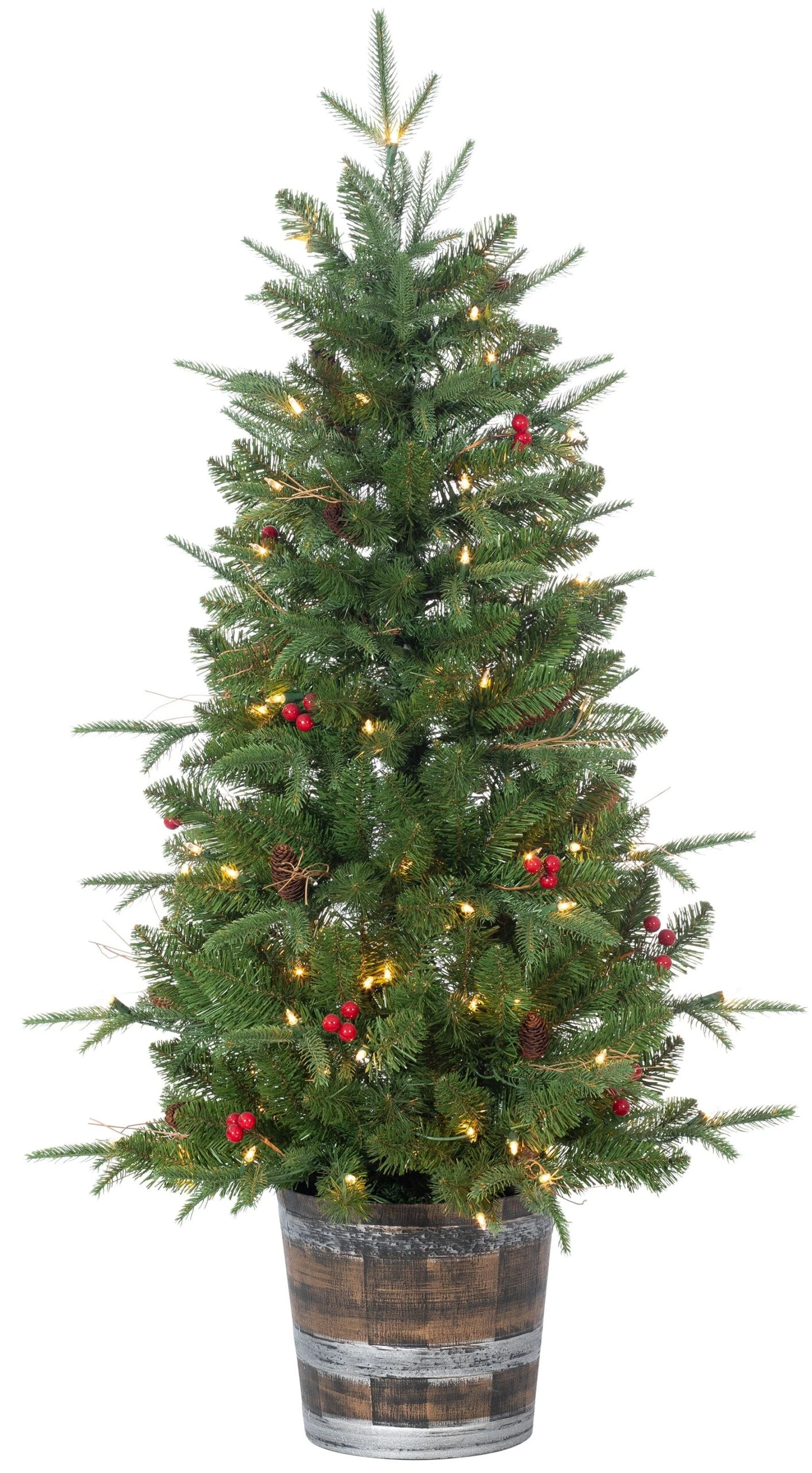 Pine cones and berries are scattered though it’s 815 branch tips that allow plenty of room for your treasured decorations. This tree rests in a gorgeous decorative barrel-styled pot for stability while adding a hint of elegance to your holiday décor.