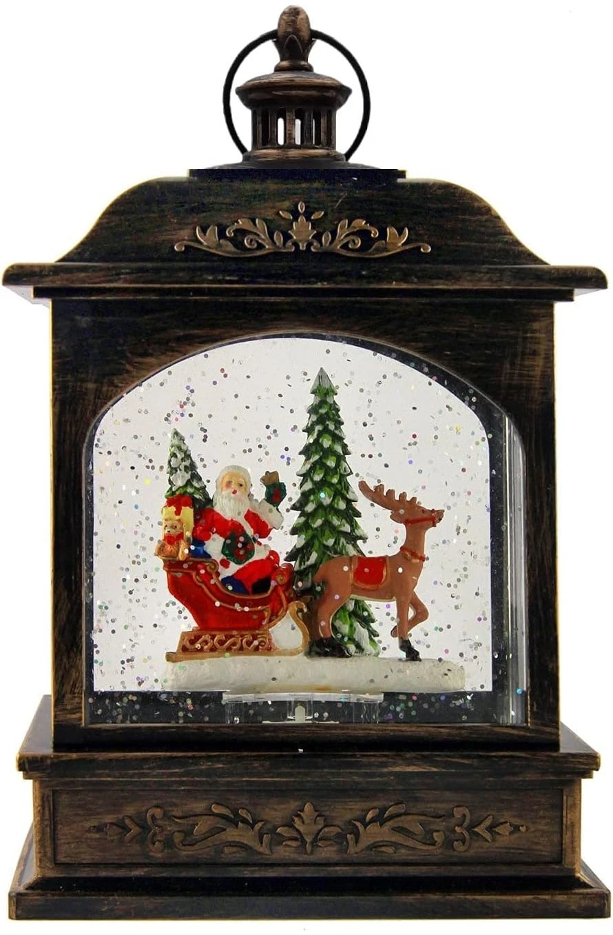 - One lantern features Santa in his sleigh being pulled by a reindeer in front of snow-covered trees