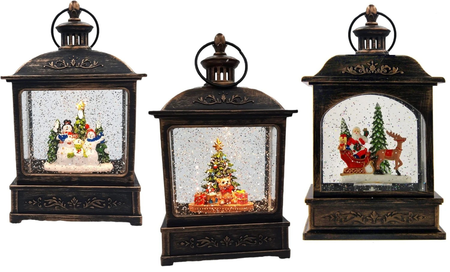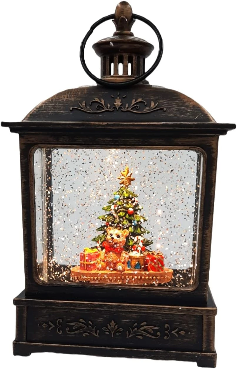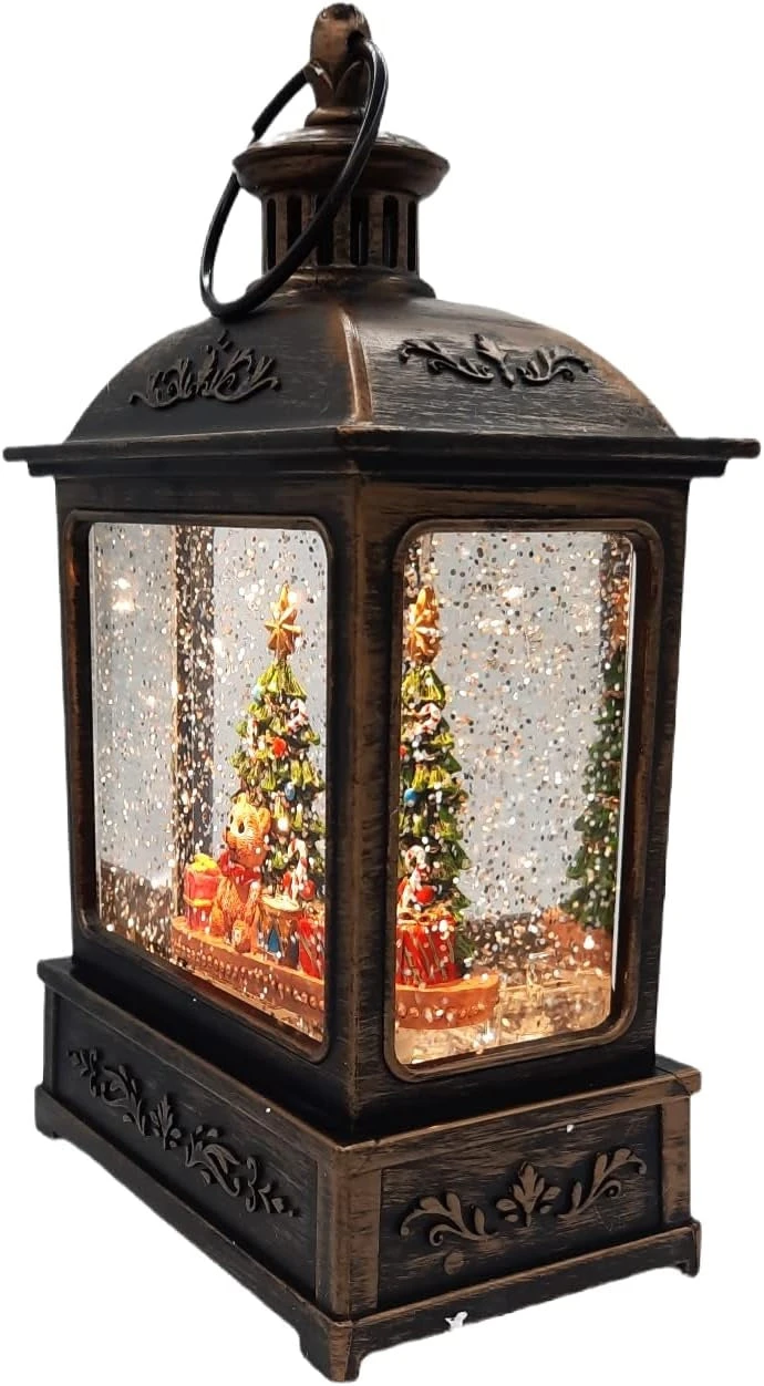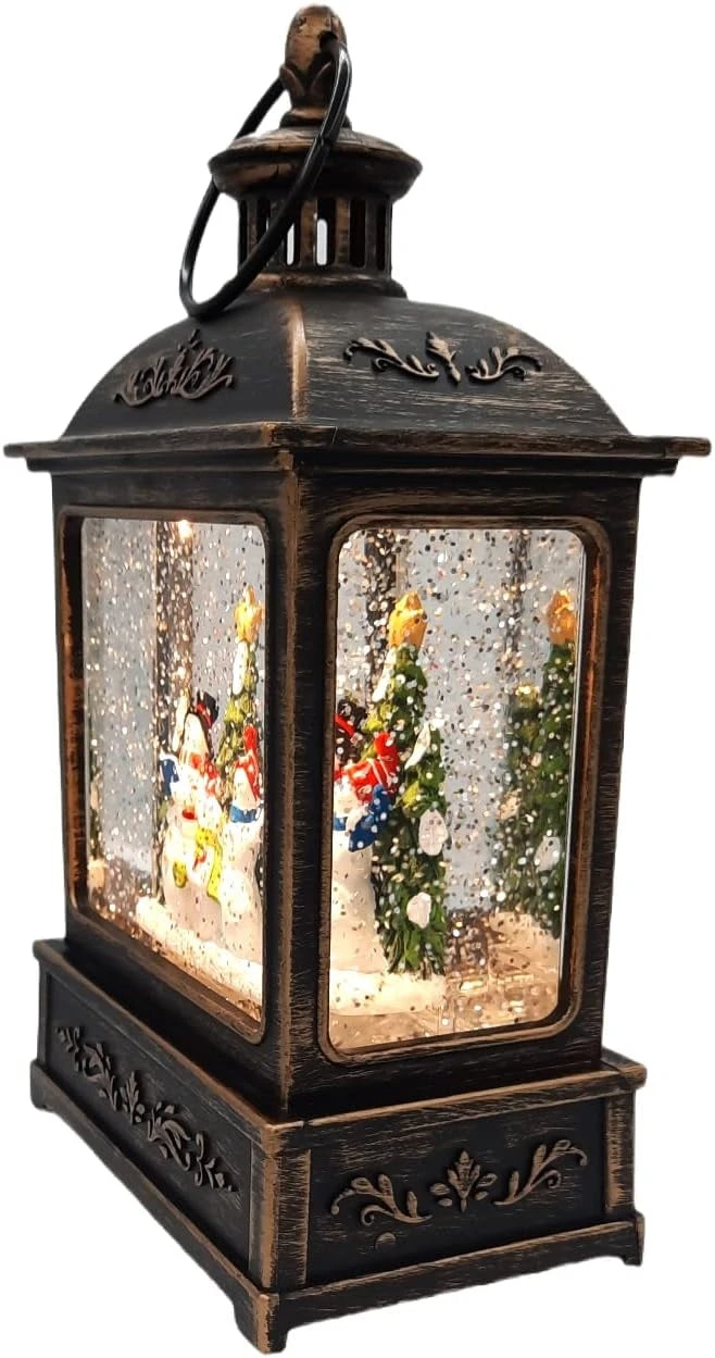 Use this Lighted Lantern Holiday Snow Globe for that perfect whimsical touch to your holiday decorating this season. The antique bronze lantern frame features continuous swirling glitter and an adorable, winter scene.