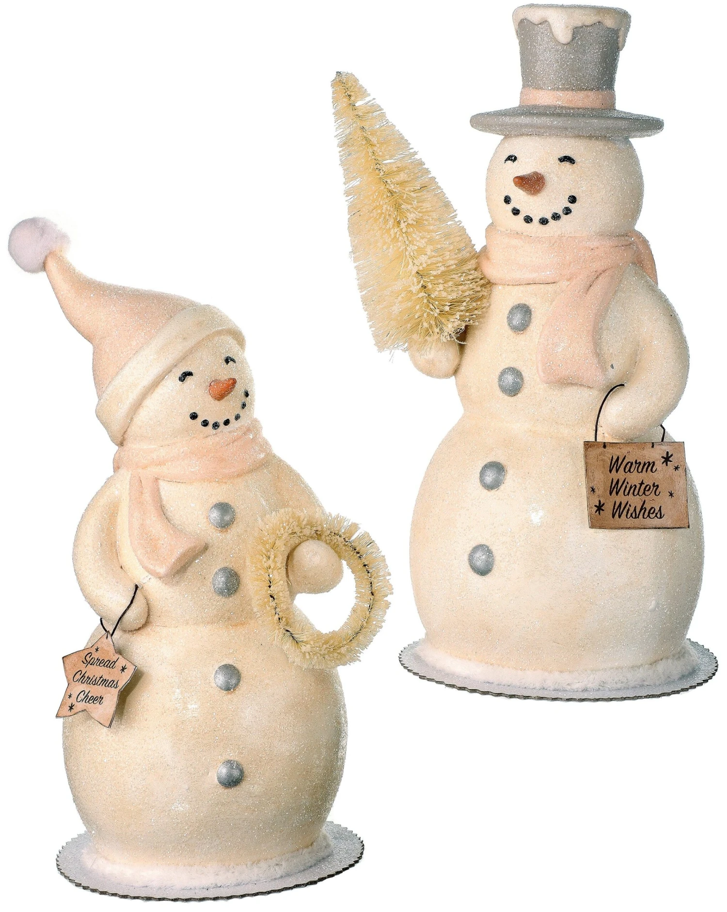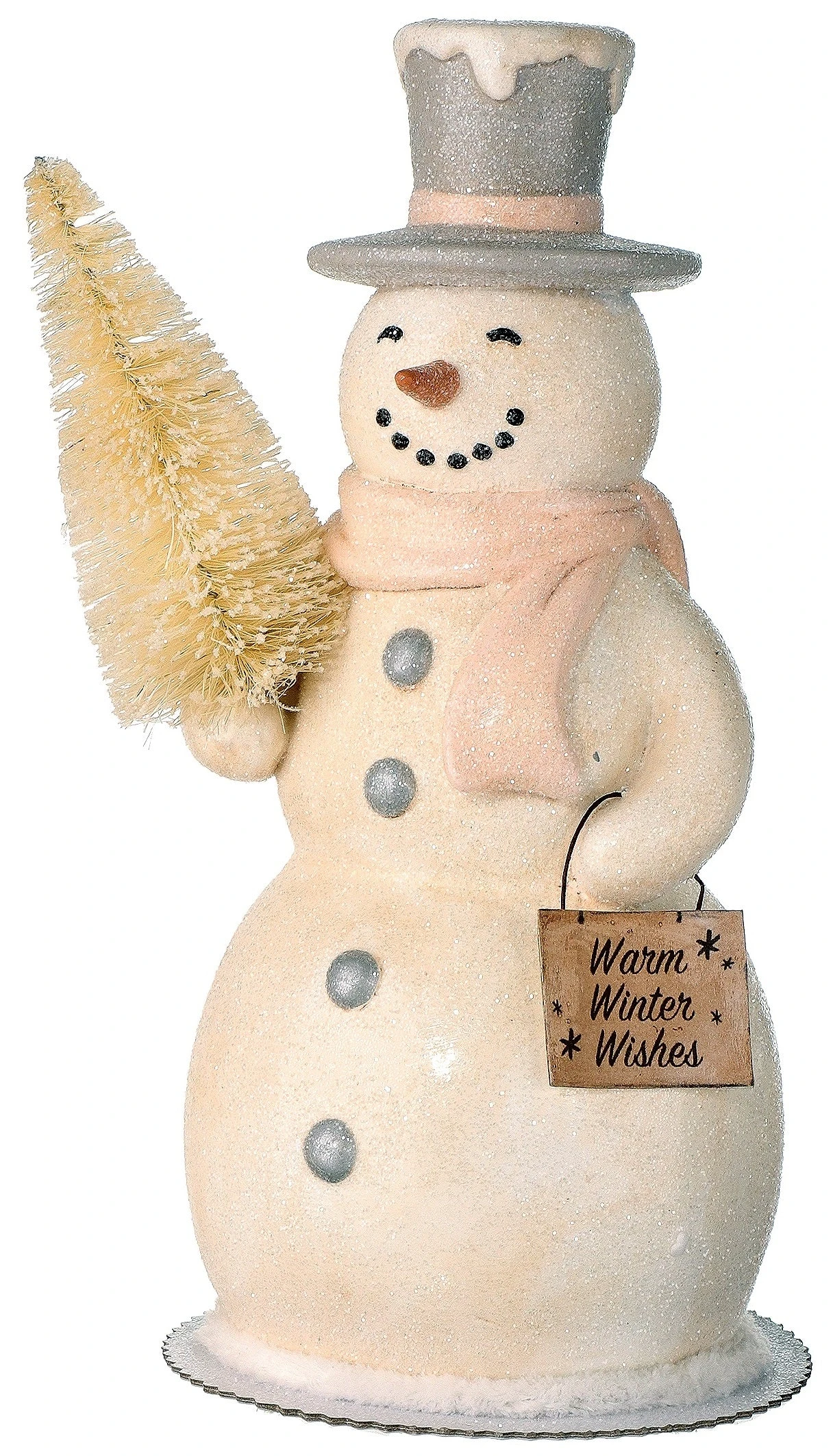 - One snowman is wearing a top hat and is holding a tree and a square sign that reads “Warm Winter Wishes”