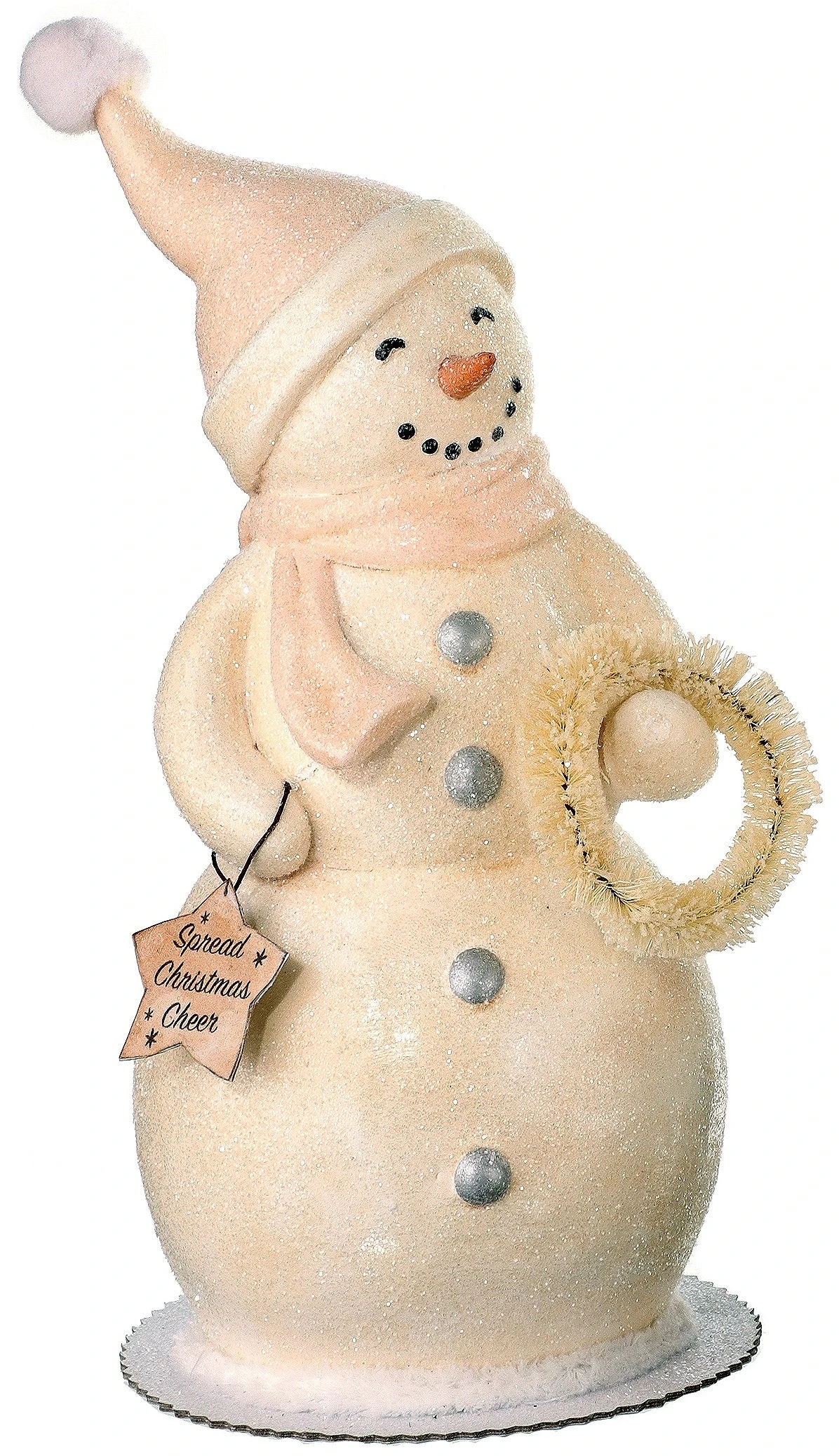- One snowman is wearing a Santa hat and is holding a wreath and a star sign that reads “Spread Christmas Cheer”