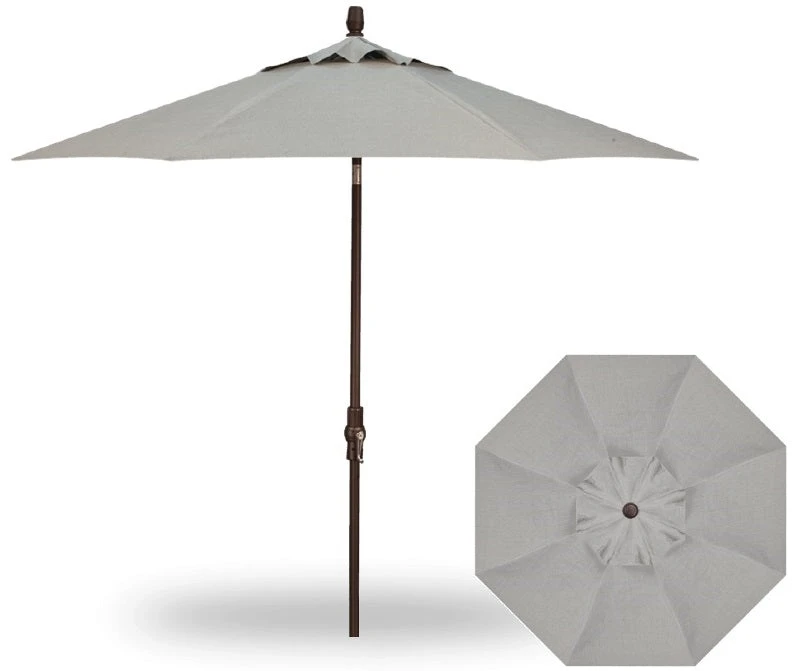 This easy-to-use 9′ Collar Tilt Market Bronze Frame Silver Linen Canopy Umbrella features a rotational tilt “collar” that operates from just above the crank on the umbrella’s pole. This unique feature allows you to direct shade from one spot to any desired angle and direction. The 1.5″ diameter pole and frame is all aluminum and is powder-coated to prevent weathering.