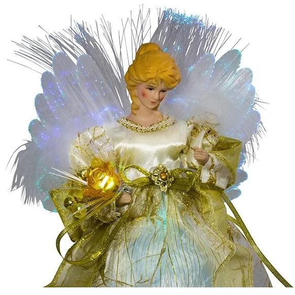 This Fiber Optic Ivory and Gold Color-Changing LED Angel Tree Topper is a fun and festive addition to your Christmas tree décor. This strawberry blonde angel looks beautiful in her ivory and gold gown. She holds a bouquet of flowers in her left hand that are illuminated by LED lights. Her fiber-optic color-changing angel wings and bouquet sets her apart from all other angels.