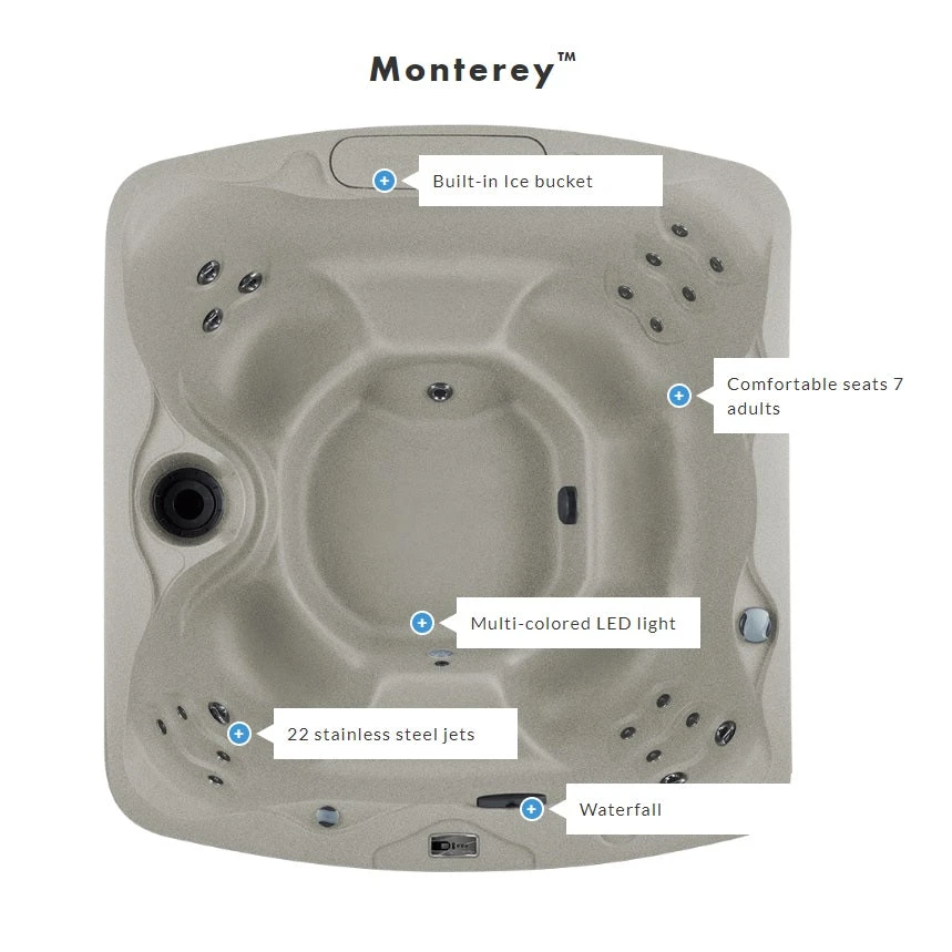 This Freeflow Spas Monterey™ Premier Hot Tub is one of the largest spas in the Freeflow line, comfortably seating 7 adults. Unique to this spa is a built-in ice bucket that holds your beverages of choice. The Monterey is easy to set up, no electrical hard-wiring is required and its made from tough, weather-resistant materials. It features 22 hydrotherapy jets with stainless steel trim and full foam insulation to keep the electric bill low. Sit back, relax, and enjoy this spa by yourself or with friends.