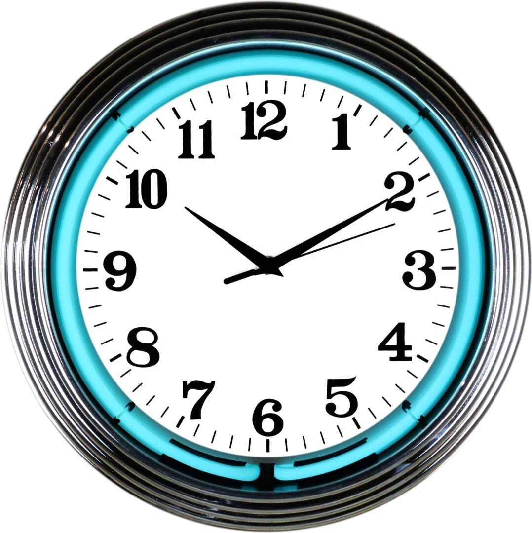 Neonetics Neon Clocks feature a hand blown ring of real glass neon, generating 25 watts of light. The neon clocks have glass faces and feature chrome finished, multi-tiered art deco styles rims.