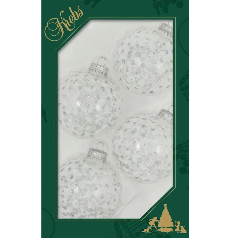 This uniquely designed Set of 4 Frosted Lace and Sparkle Glass Ornaments would be the perfect accent piece to your holiday tree or centerpiece. Ornaments feature either a clear base or a frosted base with white, sparkly lace designs.