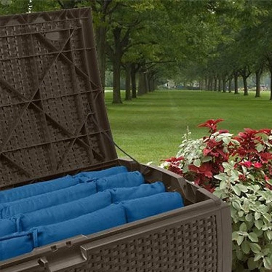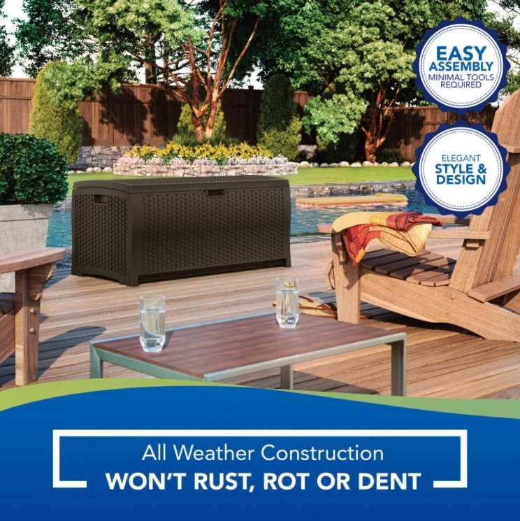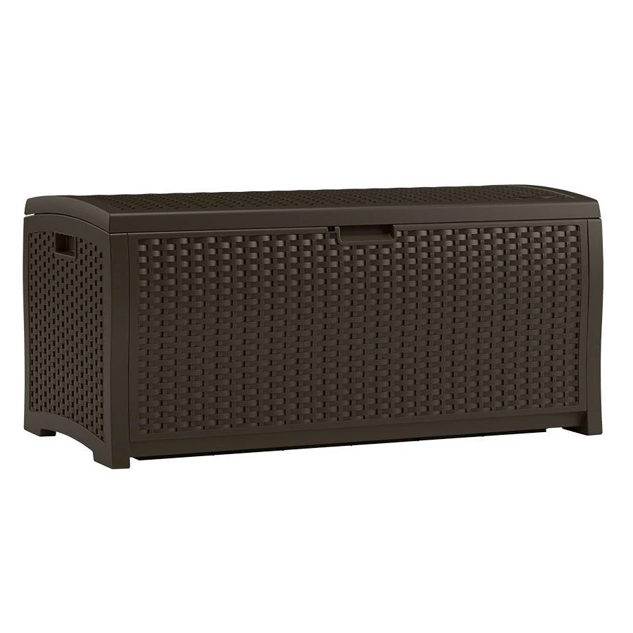 When it comes to stylish storage, look no further than this versatile Medium Deck Box from Suncast. On the outside, the unit features a decorative wicker design that looks great in any outdoor environment. The high-quality resin construction is easy to maintain and can be used all year round. On the inside, it features a generous storage capacity of 73 gal., perfect for furniture cushions, pool supplies, gardening gear, and more. The lid of the unit can even be padlocked for added security. No matter what your storage needs entail, this durable deck box will meet them with ease.