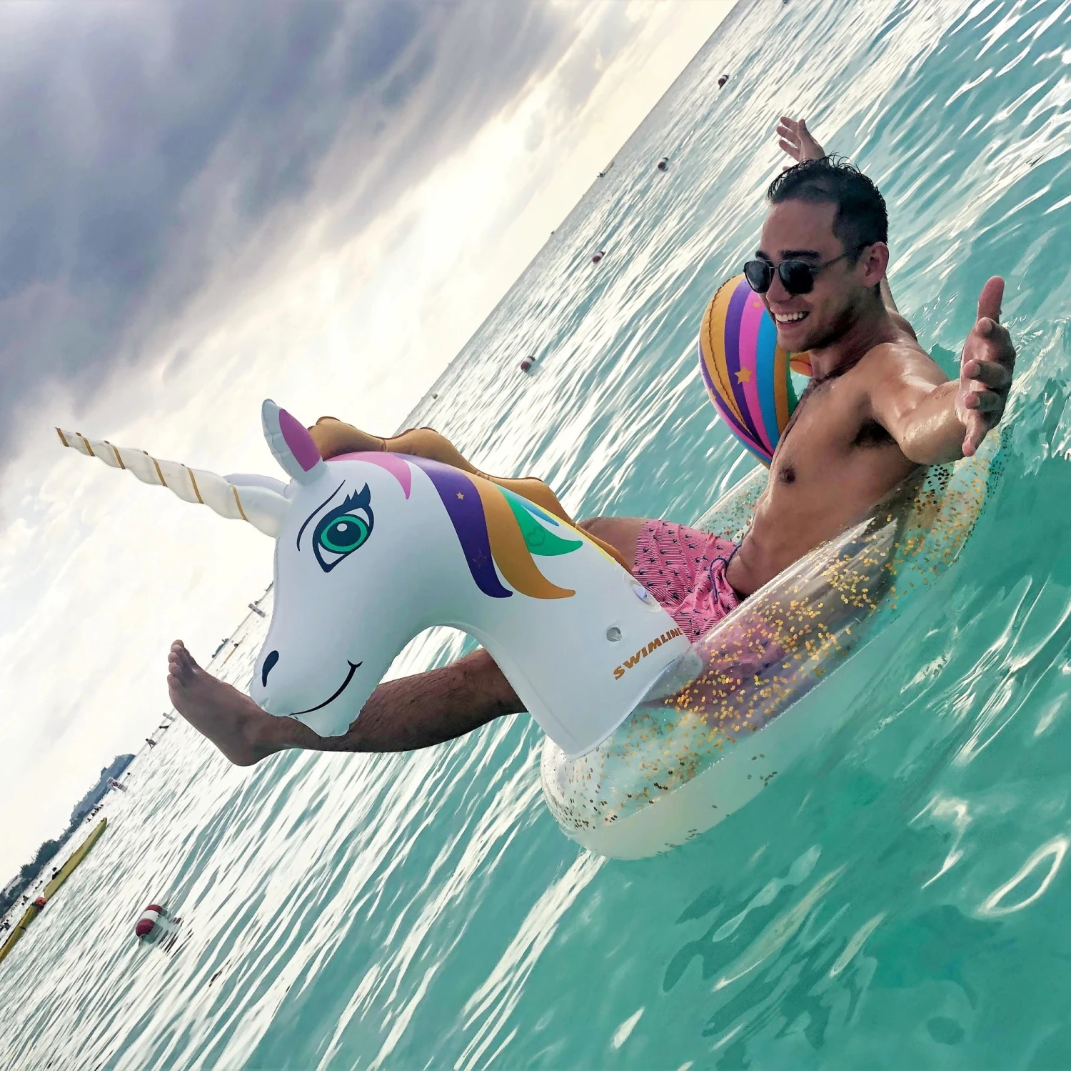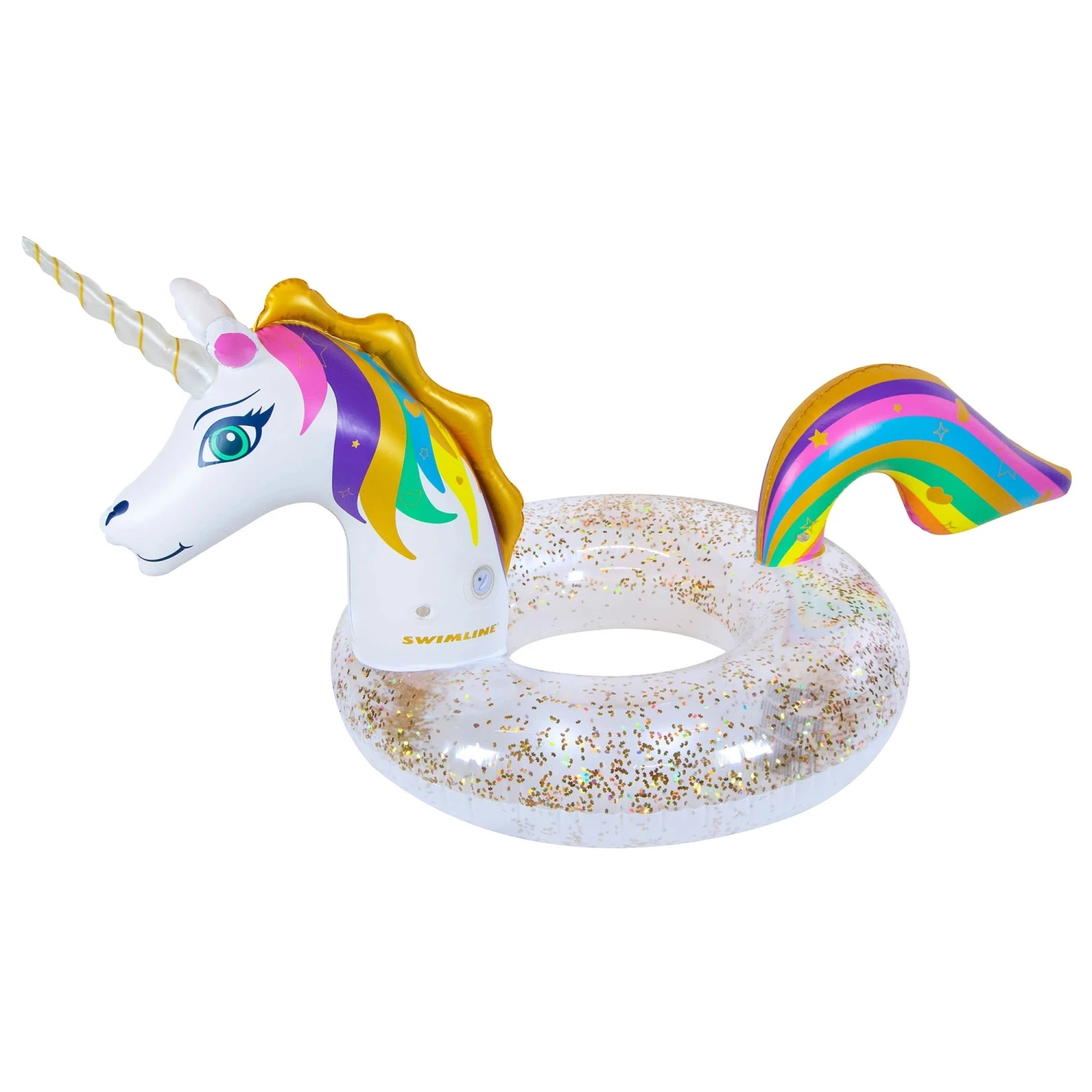 Be a unicorn in a field of horses! Be one of a kind floating on this unique Inflatable LED Unicorn Ring! Swimline’s newest edition to its signature unicorn line – now with glitter and LED lights. Sparkle wherever you float with this swim ring filled with glitter for added glamour and glitz.