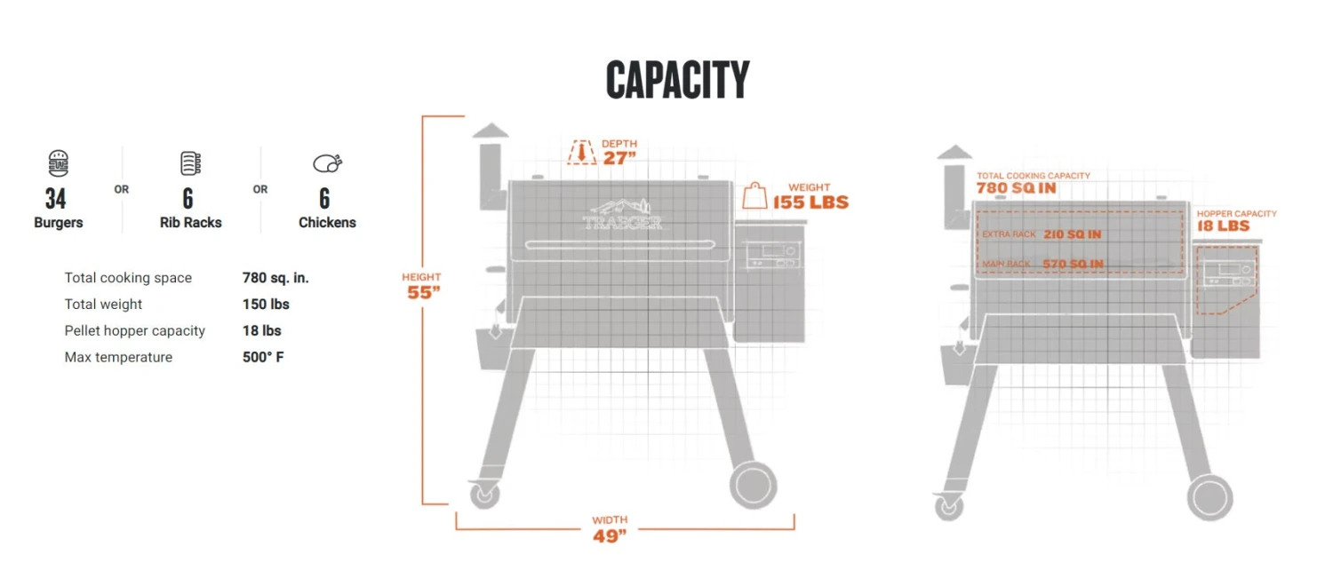 The Traeger Pro 780 Pellet Grill also allows more cooking capacity, giving you more space to cook for parties and holiday meals. Plus, the brand-new D2 direct drive features the first built-to-last, brush-less motor in the industry, as well as a variable speed fan and TurboTemp.