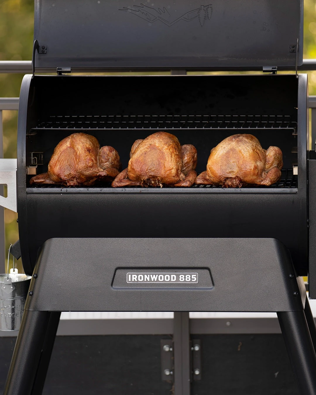 - Total cooking capacity of 885 sq. in. (for example: 10 chickens, 7 rib racks and 9 pork butts)
