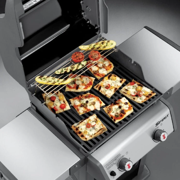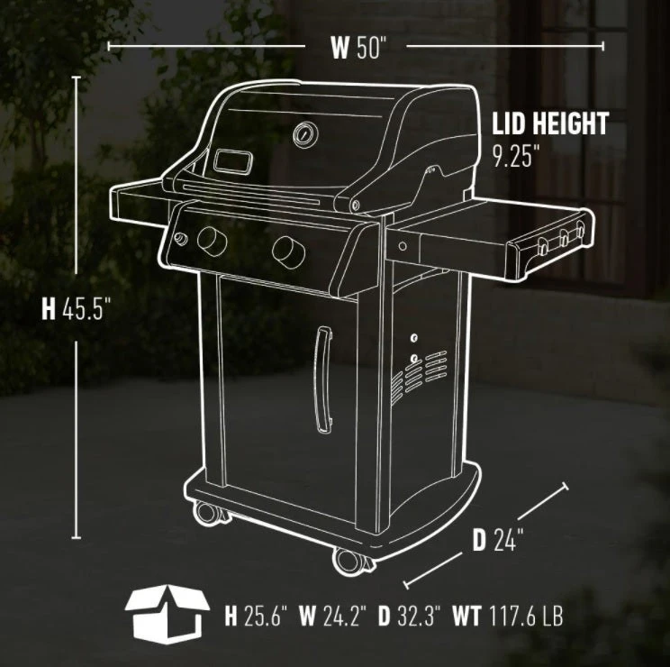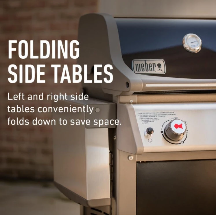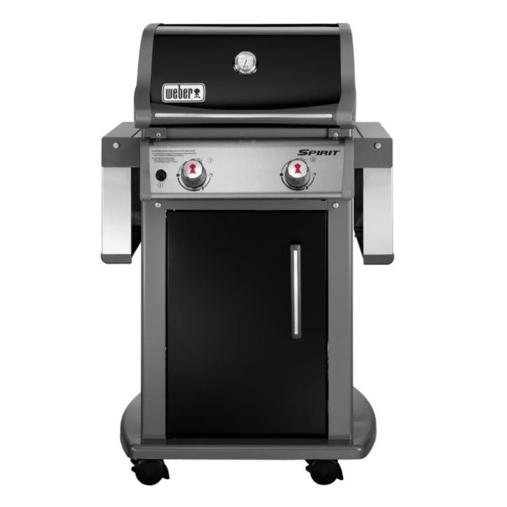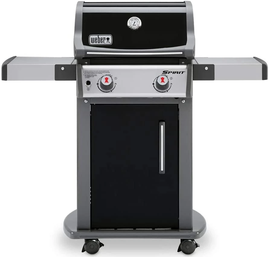 With the control panel moved to the front, the design of Weber’s Spirit E-210 2-Burner Propane Gas Grill includes two stainless steel tables that fold down for easy maneuverability and storage and boon for grillers with small patios, decks or balconies. While compact, the BBQ grill is also roomy enough to cook a 20 lb. turkey or roast meats and vegetables at the same time. Porcelain enameled cast-iron cooking grates offer superior heat retention and quick clean-up, while the porcelain-enameled shroud won’t fade, peel or rust.